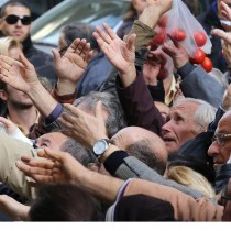 Pensionati, cittadini comuni, disoccupati s’accalcano per mendicare un sacchetto di cibo.